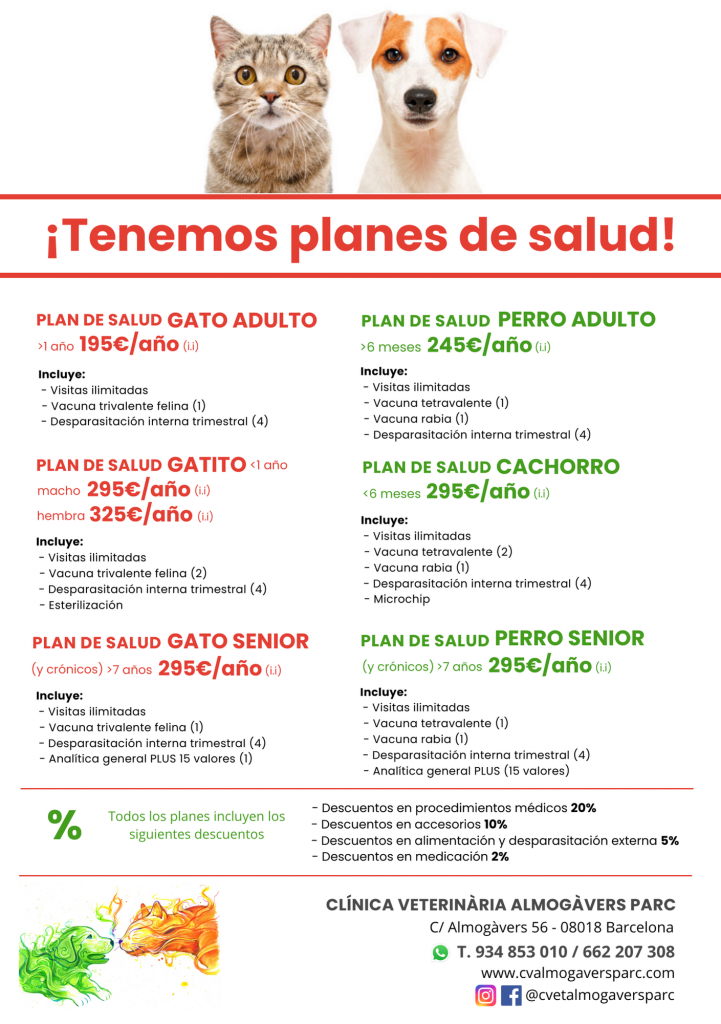 La Clínica Veterinària Almogàvers Parc os ofrece planes de salud anuales para garantizar el bienestar de vuestros animales a un precio apto para todos los bolsillos.